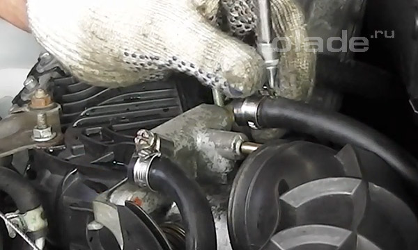 - Перед этим следует открыть крышку расширительного бачка, чтобы скинуть давление в системе охлаждения. Снимаем также вакуумные шланги.