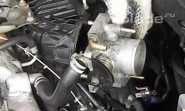 - Крестовой отвёрткой откручиваем два болта крепления. Вынимаем его. Перед установкой нового – вымоем внутри дроссельного узла все каналы. Для этого понадобится специальная жидкость для удаления сажевых отложений и нагара.